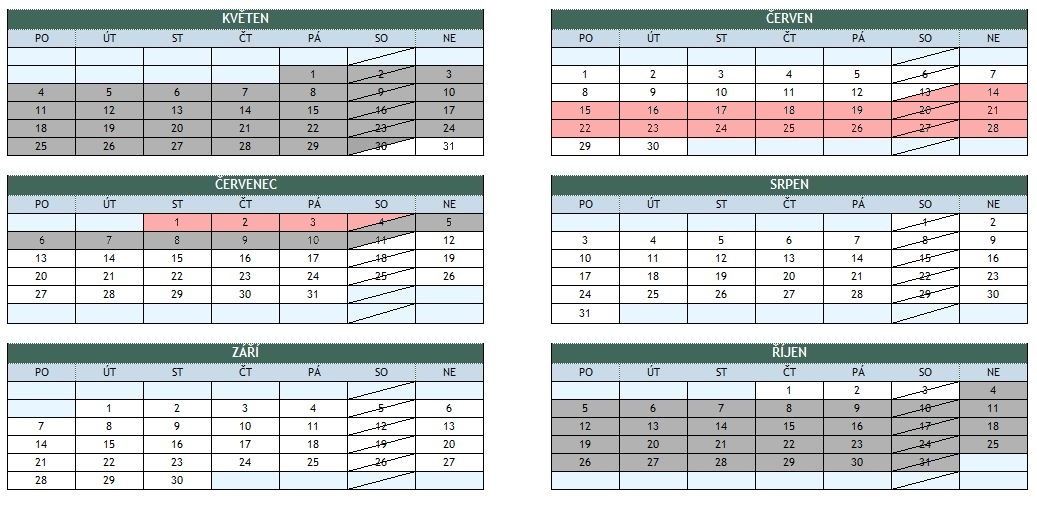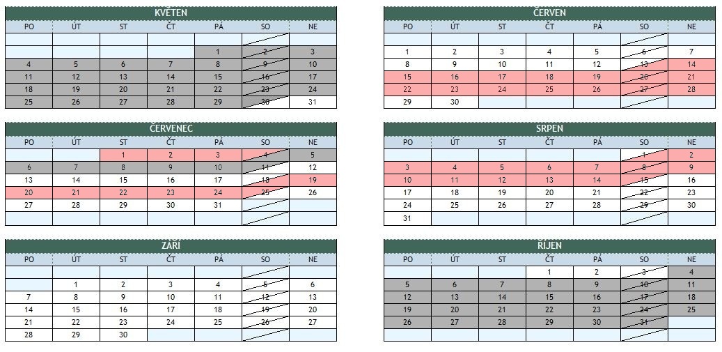 bílá = volno / červená = obsazeno / šedá = na dotaz (běžně neobsazujeme)